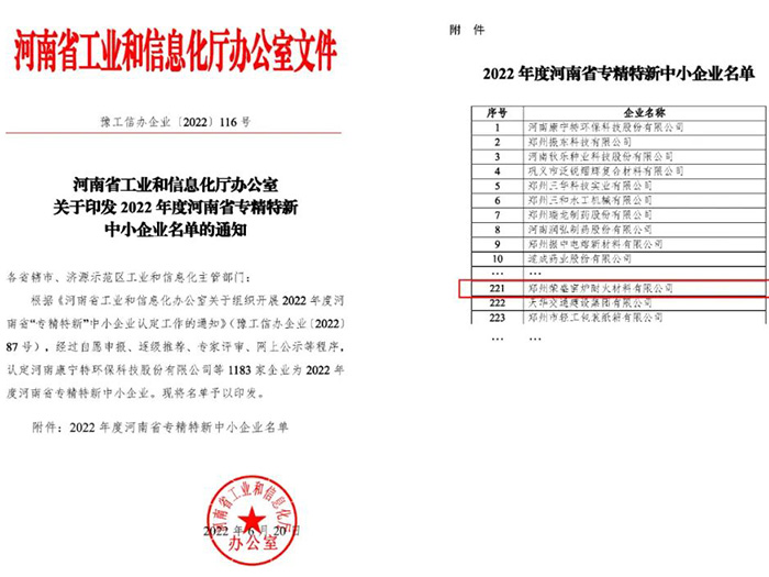 喜訊!榮盛耐材被認定為河南省“專精特新”企業~