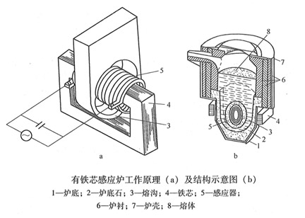 有芯感應爐是有鐵芯穿過感應器并用工頻電源供電,利用電磁感應原理使金屬爐料發熱熔化的設備。有芯感應爐具有加熱快、生產率高、金屬燒損少、操作方便、投資少、經濟效益顯著等優點,廣泛應用于化鐵、化銅、化鋅、化鋁等行業,特別是對于單一品種大批量冶煉的物料具有其優越性。